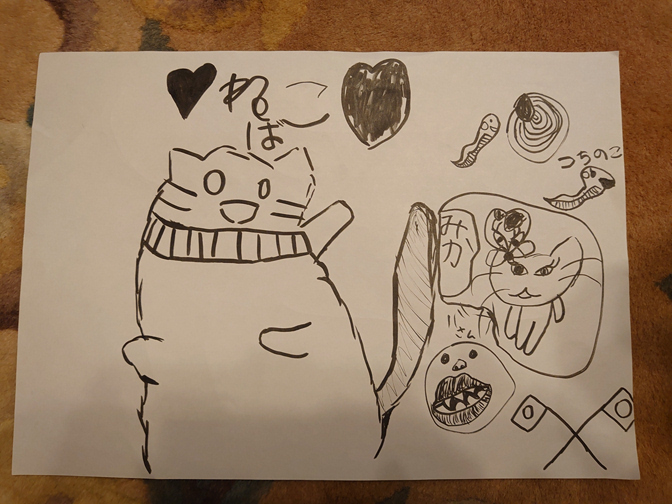 幼女のハガキに描かれるネコバ